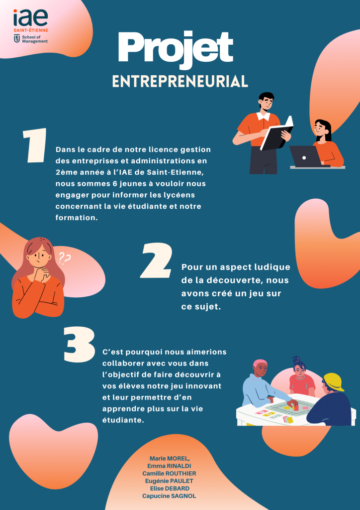 En septembre 2023, avec cinq autres étudiantes, nous avons lancé un projet entrepreneurial qui s’est étalé sur un an. Ce fut une aventure intense, ponctuée de défis, d’imprévus et de belles réussites. Dès le départ, nous avons dû faire face à des difficultés pour établir des partenariats avec des lycées, jongler avec des deadlines serrées et nous adapter aux disponibilités fluctuantes de nos interlocuteurs. Tout n’a pas toujours fonctionné comme prévu, et certains aspects du projet n’ont pas abouti comme nous l’espérions. Cependant, nous avons su tirer parti de chaque obstacle pour affiner notre organisation et renforcer notre esprit d’équipe.